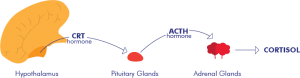 How is cortisol produced? Cortisol is produced through the communication of three glands including the hypothalamus, the pituitary and the adrenal glands. The pituitary gland is in close physical and functional association with the hypothalamus (region of the brain) and the adrenal glands are located near the horse’s kidneys. See figure 1. When the hypothalamus senses low cortisol levels, it sends a messenger (hormone CRT) to the pituitary gland to produce a messenger (hormone ACTH) which stimulates the adrenal glands to produce cortisol. When cortisol levels in the blood rise to normal the production of CRT and ACTH (messengers) stops, which in turn stops the production of cortisol. This regulation system maintains cortisol levels within a normal range.